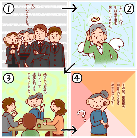 夫が死亡し、妻と子ども3人で、不動産と預金、株券などを相続することになりました。遺言書がないので、遺産分割の話合をして分けたいと思いますが、その間、相続税の申告はどうなるのでしょう?