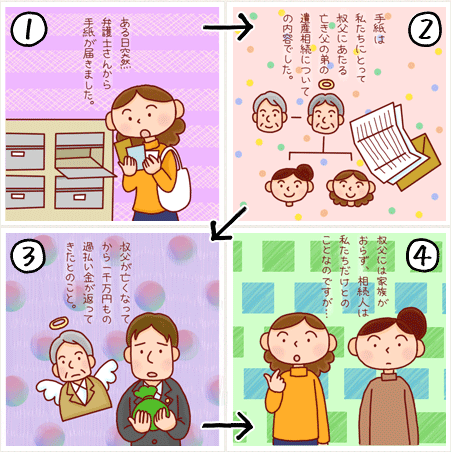 弁護士さんから突然お手紙をいただき、亡き父の弟に当たる叔父の、遺産を相続するよう勧められました。叔父はその弁護士さんに過払い金の請求を依頼していたのですが、一千万円ものお金が戻る直前に亡くなり、家族はおらず、親切な弁護士さんがやっと探し当てた相続人が、私と妹の2人だけということなのですが・・・。