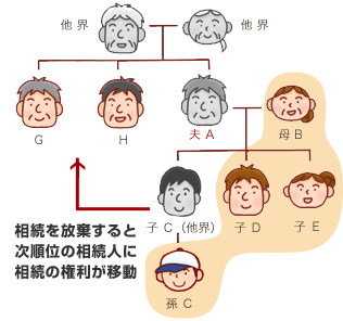 もし、この4人が相続放棄すると、第2順位の相続人はAさんの両親ですが、既に死亡しているので、第3順位の相続人であるG、Hさんが相続することになります。この2人が相続したくない場合、相続放棄の手続きをする必要があります。